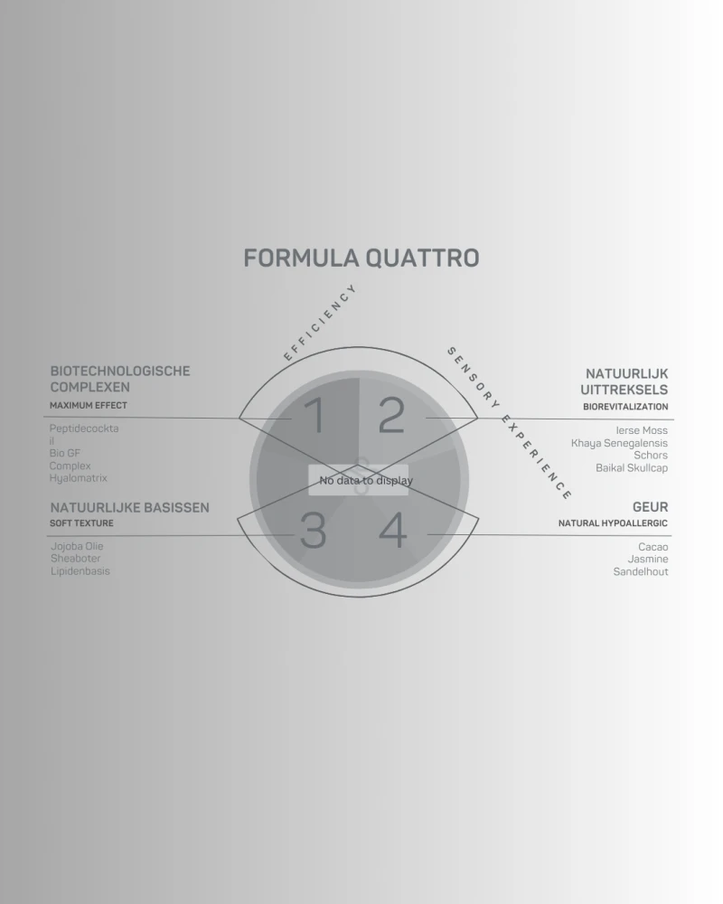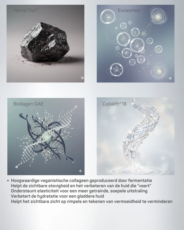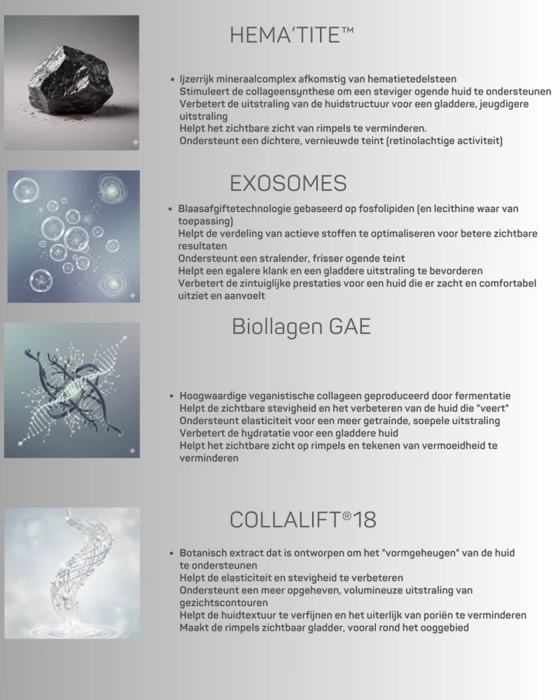 Geavanceerde werkzame stoffen zoals peptidencomplexen, fyto-oestrogenen en vitamines ondersteunen huidherstel en anti-aging.